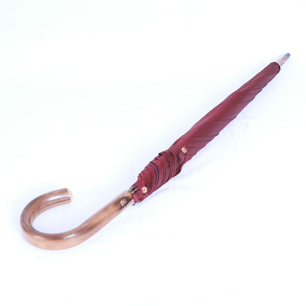 Ombrello pieghevole manuale montato su fusto 2 sezioni in acciaio con 8 stecche antivento, tessuto in poliestere e cotone resinato tinto in filo, manico in legno di faggio.
